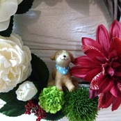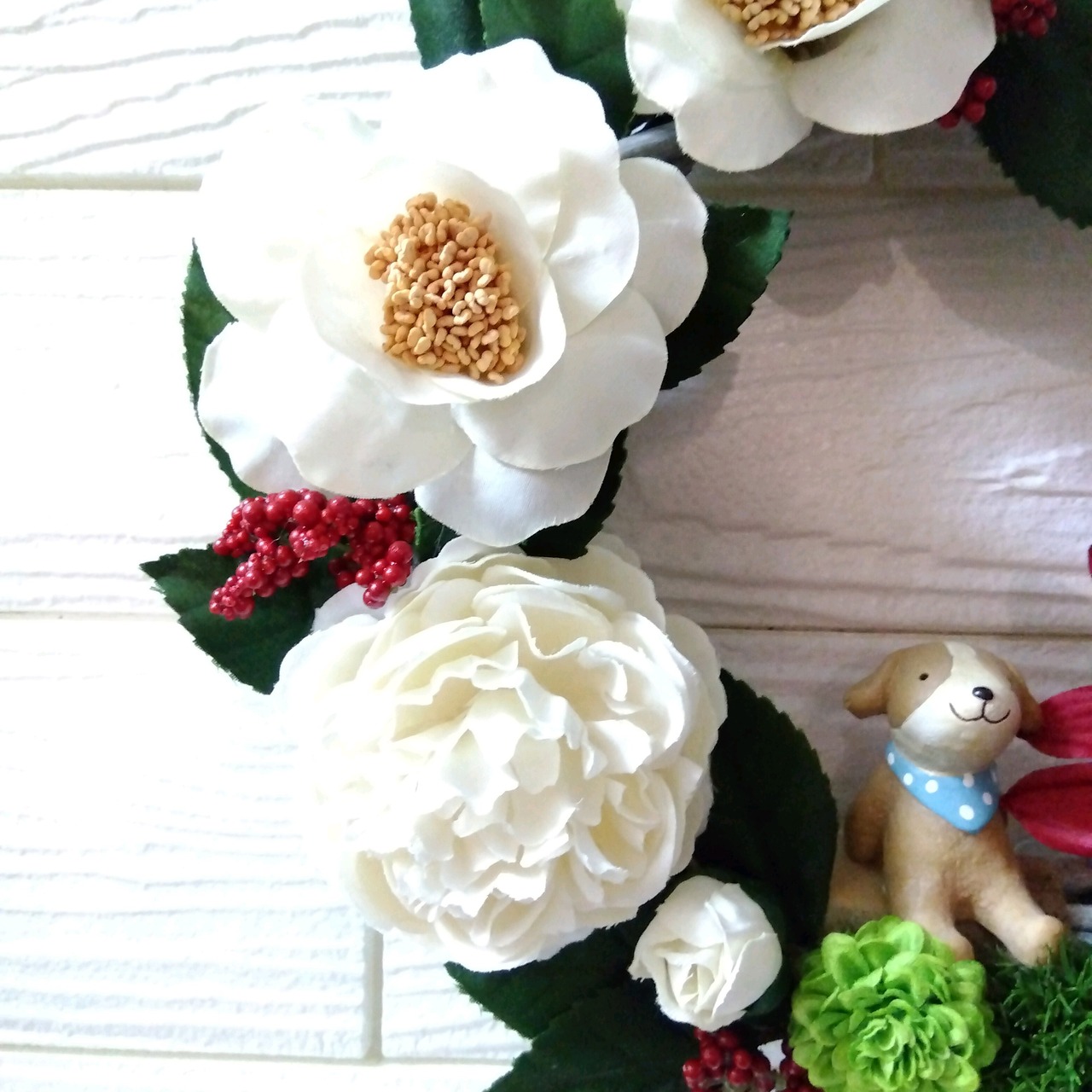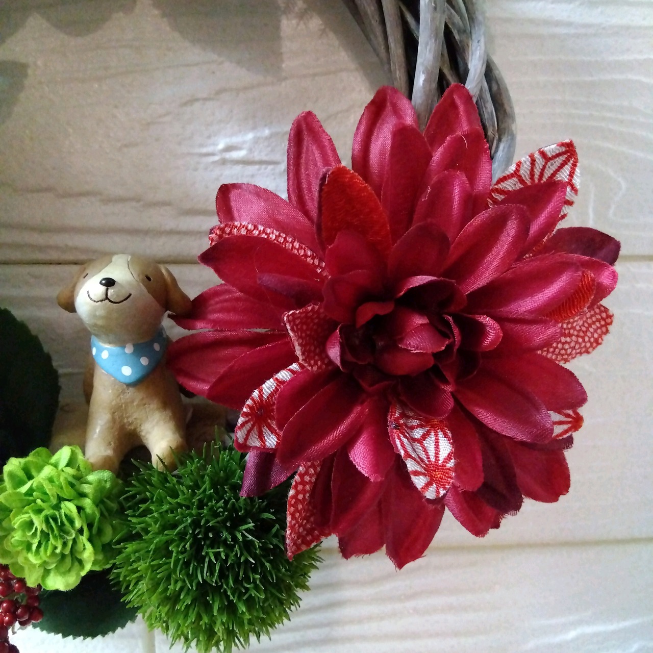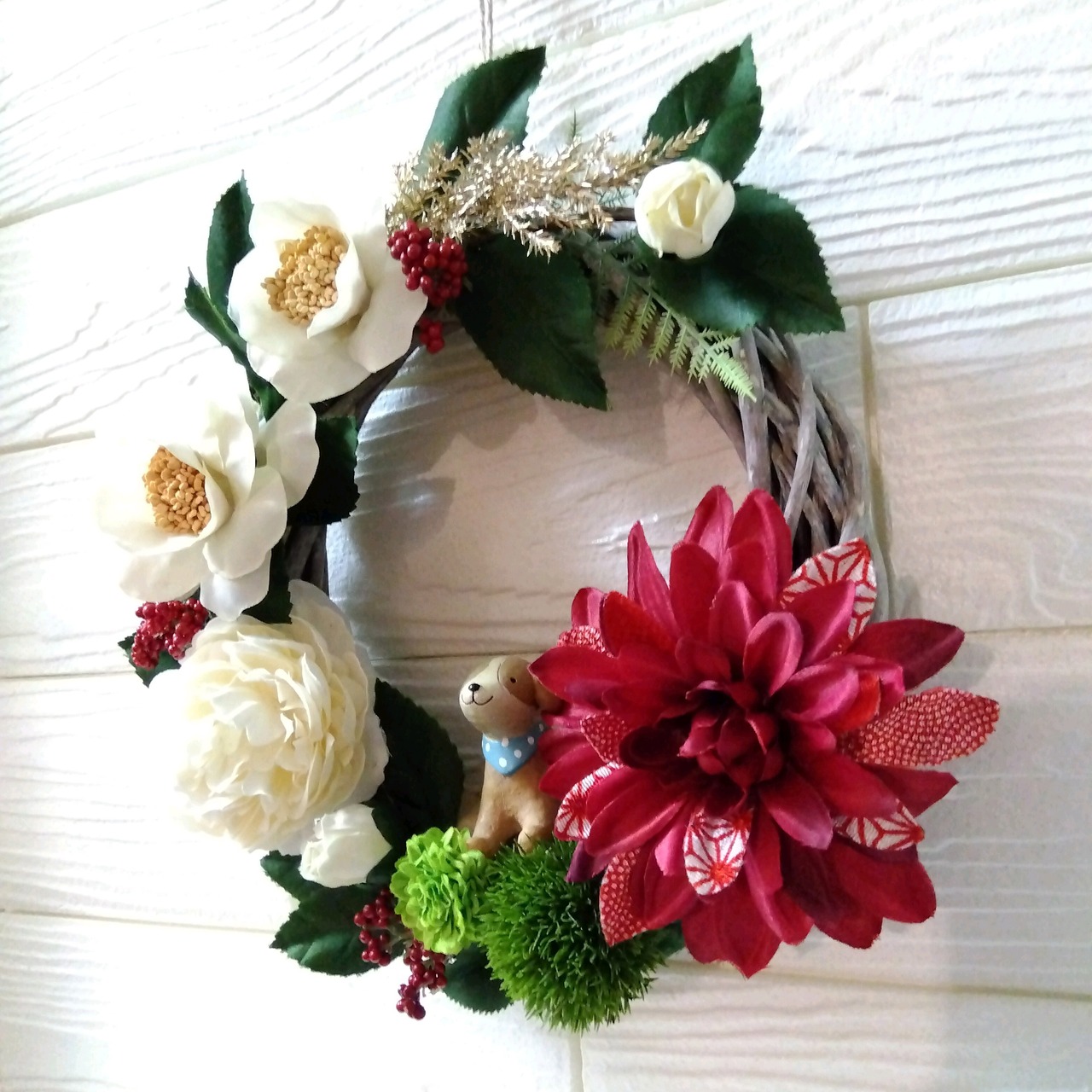 お正月 ダリア と 椿 の 和風リース 紅白 イヌ