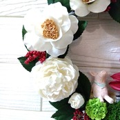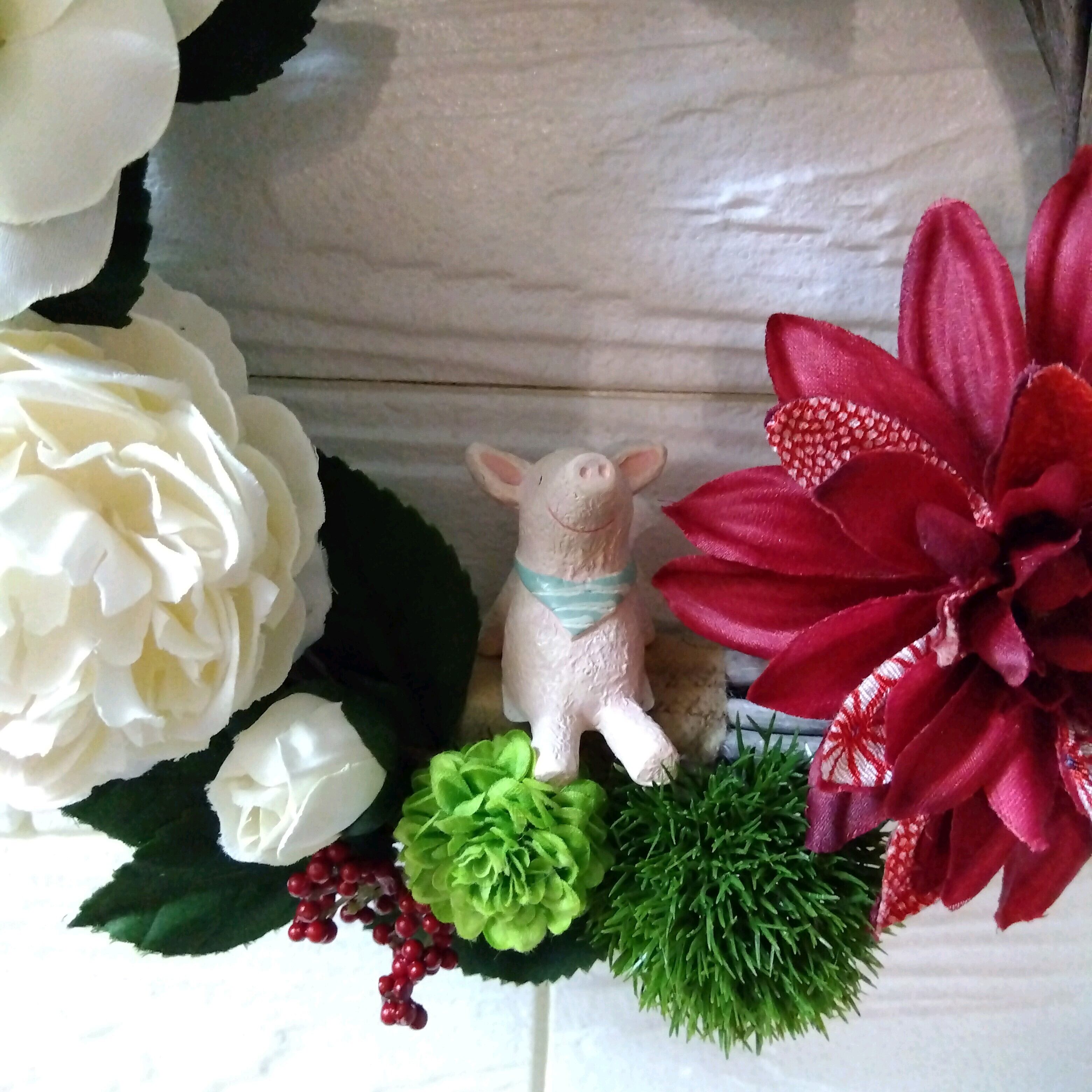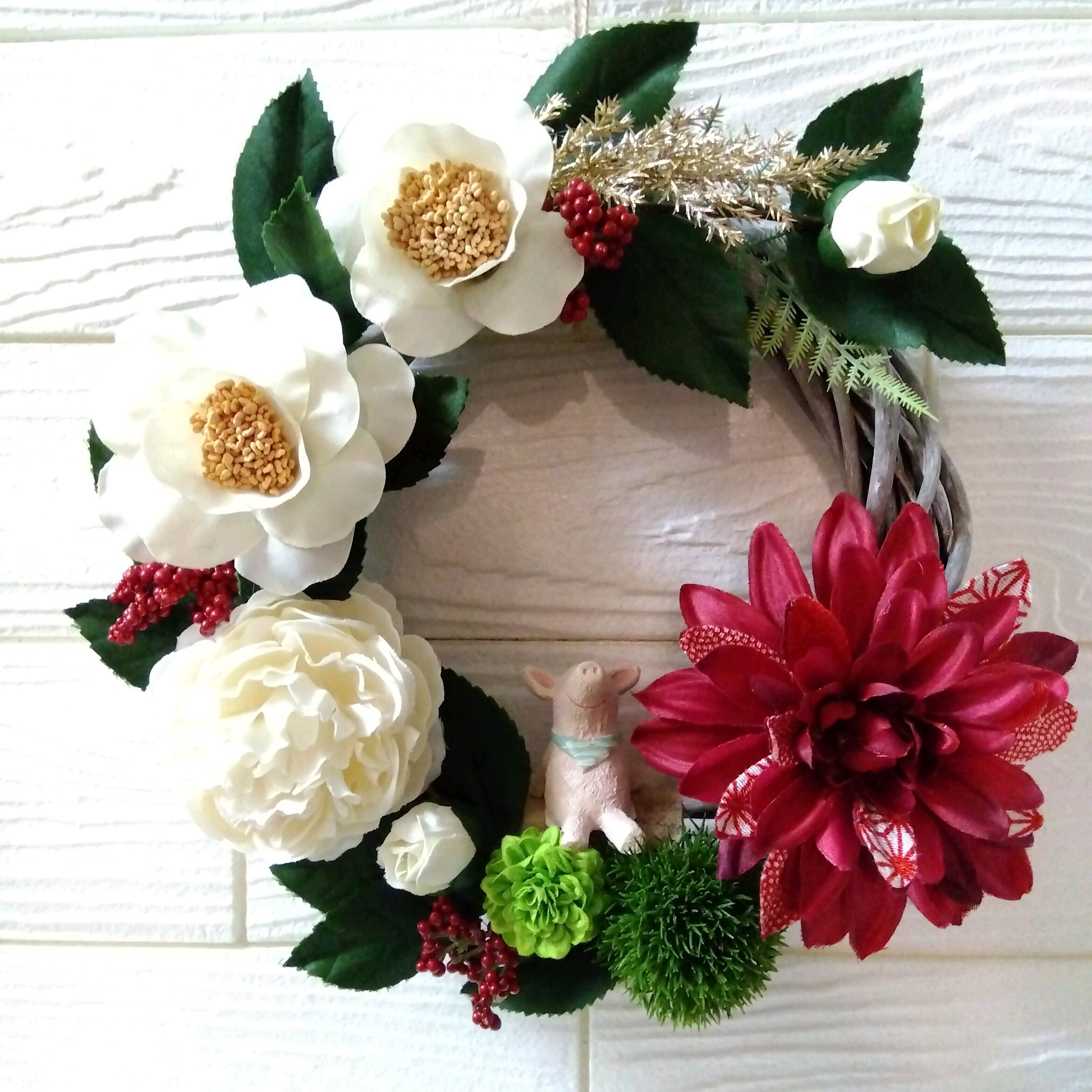 お正月 ダリア と 椿 の 和風リース 紅白 ブタ